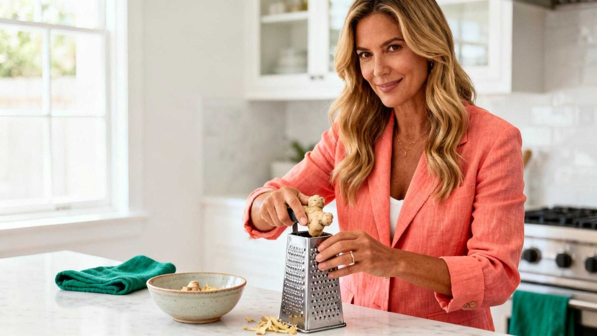 Cuisine baignée de lumière hivernale. Râpage du gingembre frais libérant ses arômes piquants. Eau tiède fumante à 37°C dans la tasse blanche. Première gorgée épicée réveillant papilles et foie simultanément. Rituel de 2 minutes. Transformation en 21 jours. Ventre plat mesurable. 0,30 € par jour. Science française validée par 10 000 Françaises.