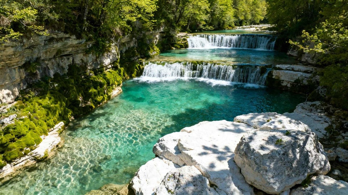 Trois paliers principaux forment des bassins naturels peu profonds. Parfait pour tremper les pieds en été. La lumière filtrée par la canopée crée des jeux d'ombre et de reflets.