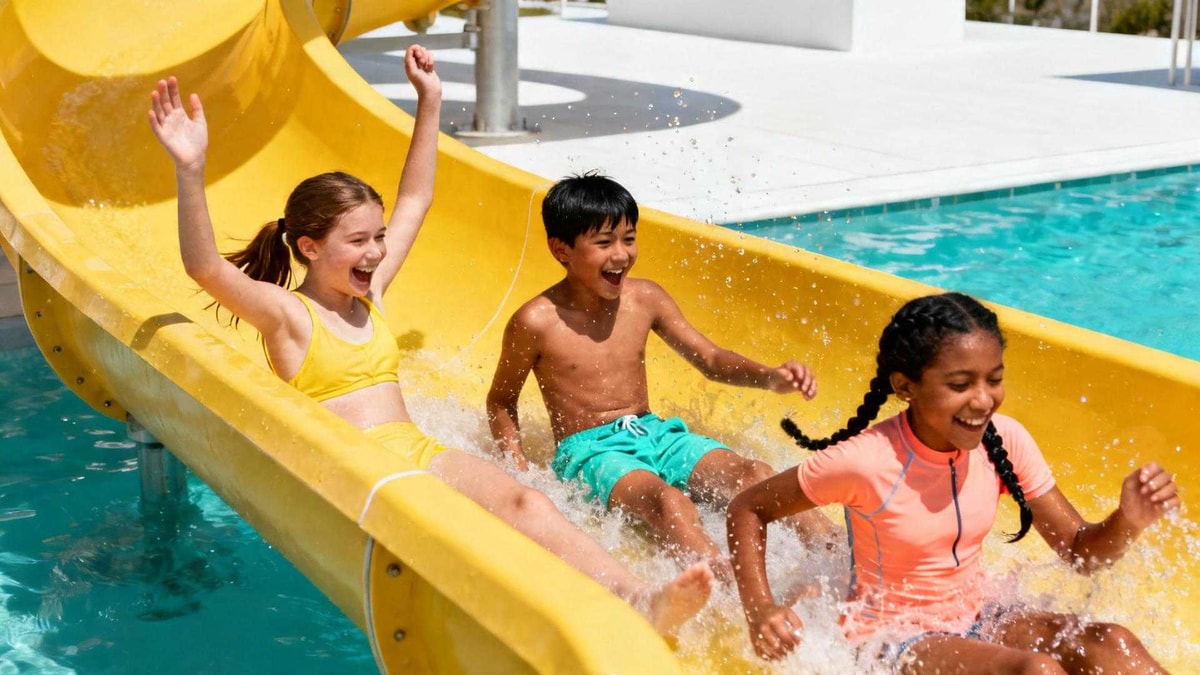 Fosse de plongée : initiation encadrée avec masques fournis. Sensations à 10 mètres de profondeur pour adolescents et adultes. Toboggans extérieurs : descentes rapides de 30 secondes environ.