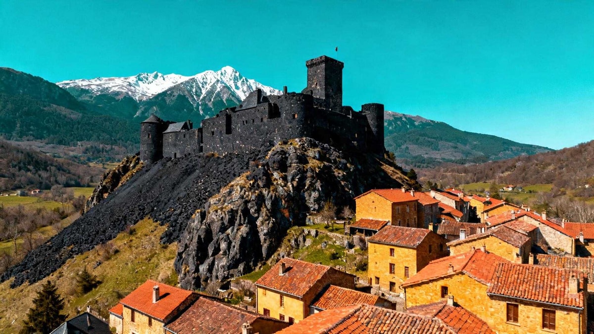 Le basalte noir contraste avec les toits rouges du village. Cette pierre volcanique donne au château une allure dramatique. Les maisons vernaculaires en pierre ocre rappellent la Toscane ou l'Écosse.