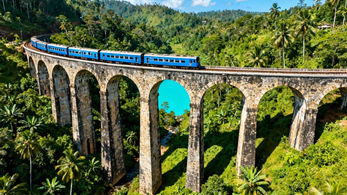 Le sifflet résonne dans la vallée. Un train bleu émerge lentement de la jungle sri-lankaise. Devant lui, neuf arches de brique ocre enjambent le vide sans un gramme d'acier.