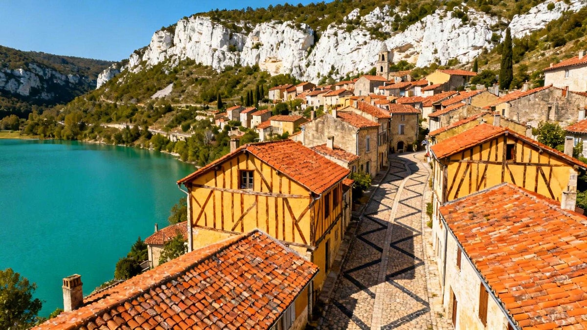 Les ruelles pavées de la ville haute s'éveillent sous la lumière dorée du matin. Les maisons à colombages centenaires révèlent leurs façades ocre contre le ciel du Quercy Blanc. Au pied des contreforts calcaires, le lac Malivert scintille dans le silence.