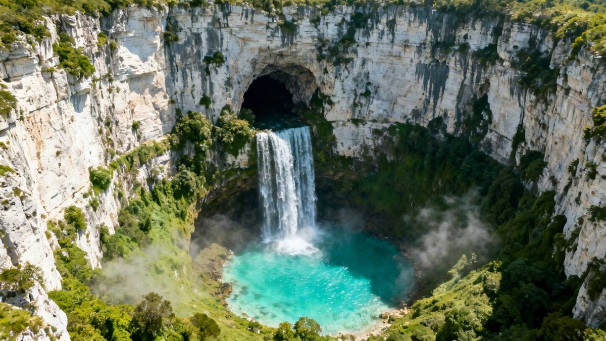 La grotte de 120 mètres s'ouvre comme une nef souterraine. Son entrée de 70 mètres évoque une cathédrale minérale. La cascade de tuf chute dans un bassin turquoise où se reflètent les falaises.
