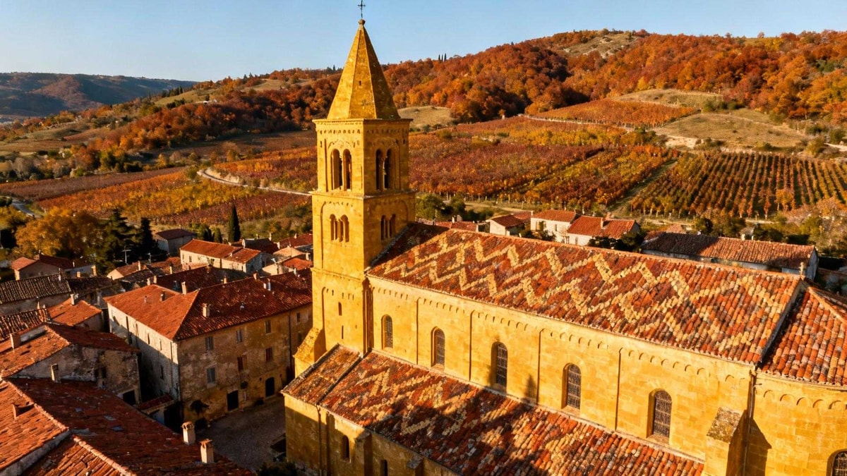 La pierre calcaire locale arbore des teintes ocre dorées uniques. Les toits de tuiles rouges contrastent avec la végétation automnale rougeoyante. Les chapiteaux historiés racontent l'art roman à son apogée.