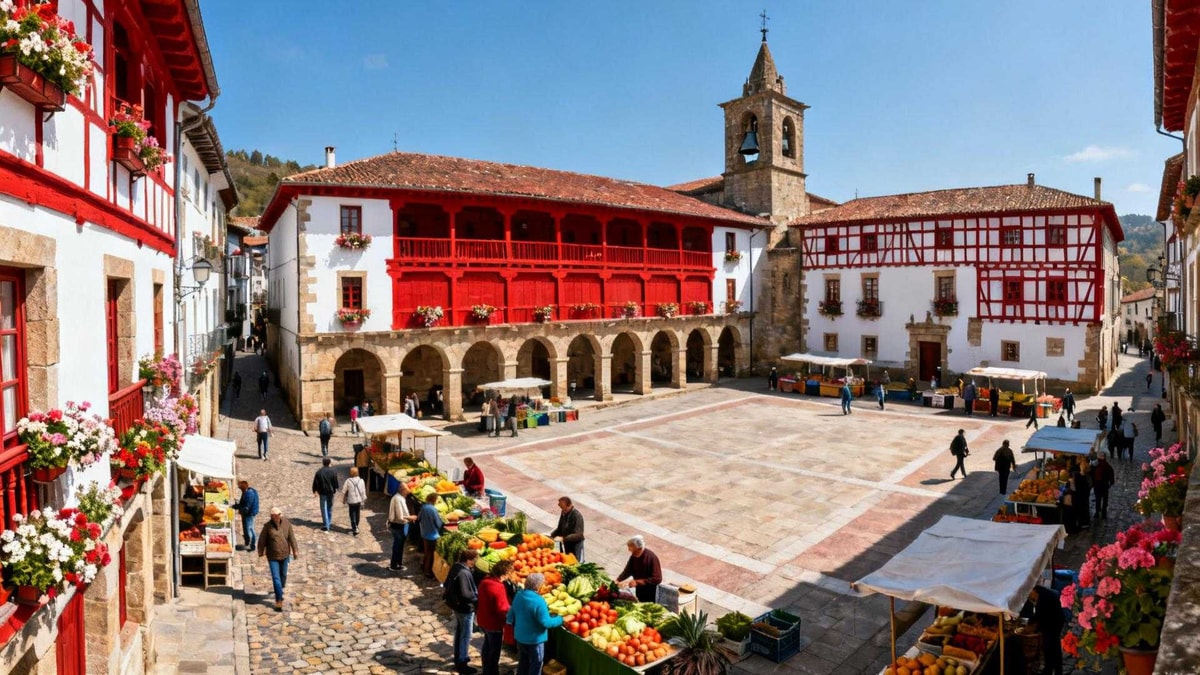 La place rectangulaire de 30 mètres sur 70 accueille les producteurs locaux. Fromages de brebis, piment d'Espelette, txistorra. Les échanges restent authentiques entre villageois et visiteurs.