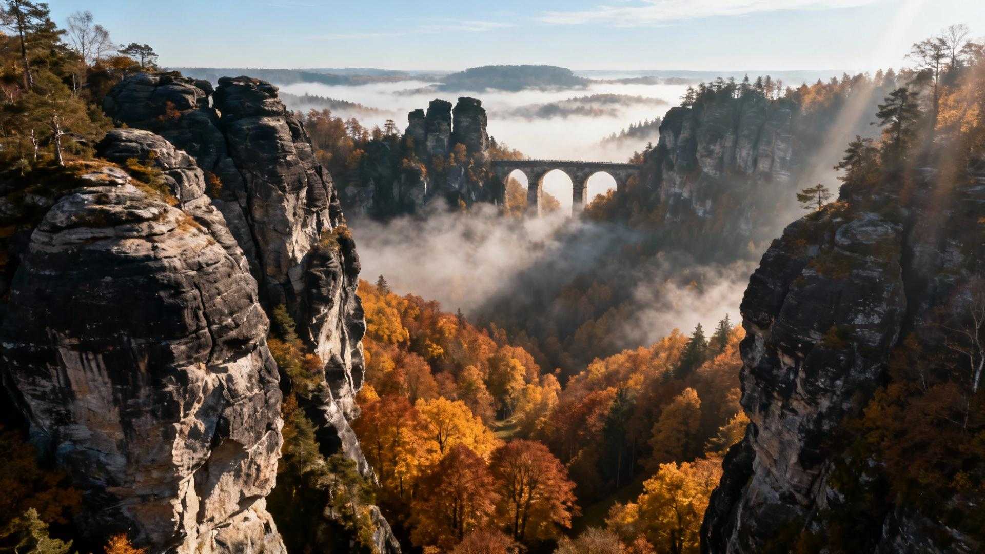 Frühherbst bringt Temperaturen zwischen 7 und 18 °C. Morgennebel steigt aus dem Elbtal auf und umhüllt die Sandsteintürme. Fotografen wissen: Die beste Zeit beginnt um 6:30 Uhr, wenn die ersten Sonnenstrahlen den Nebel durchbrechen.