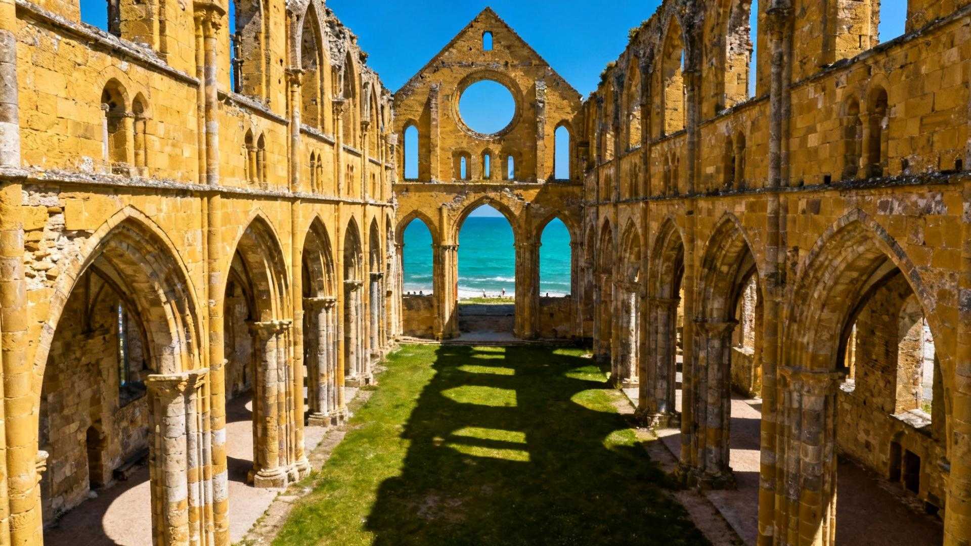 Romanische und gotische Kirchenruinen wie St. Karin und St. Nikolaus prägen das Stadtbild. Goldener Sandstein kontrastiert mit roten Dächern. Türkisblaues Ostseewasser schimmert zwischen den Gebäuden hindurch.