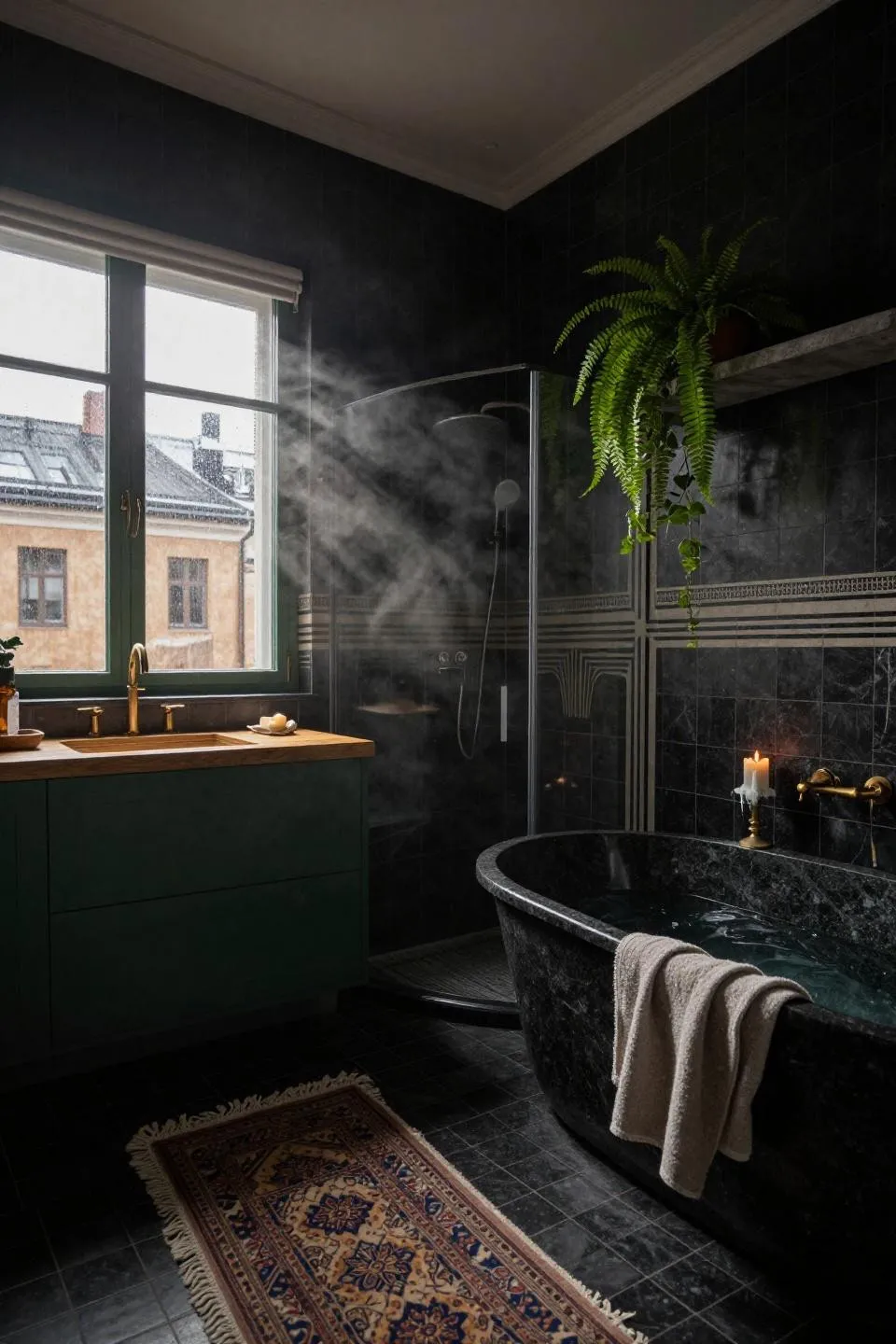 Unlacquered brass clawfoot tub. That’s the splurge. Charcoal slate walls stay affordable. Aged brass fixtures develop patina naturally—no faking it with oil-rubbed bronze. One velvet curtain caught mid-sway adds movement (static rooms feel dead). Dried eucalyptus bundle hangs from a brass hook because eucalyptus actually survives steam. This layout works in Notting Hill conversions and Brooklyn brownstones equally well.
