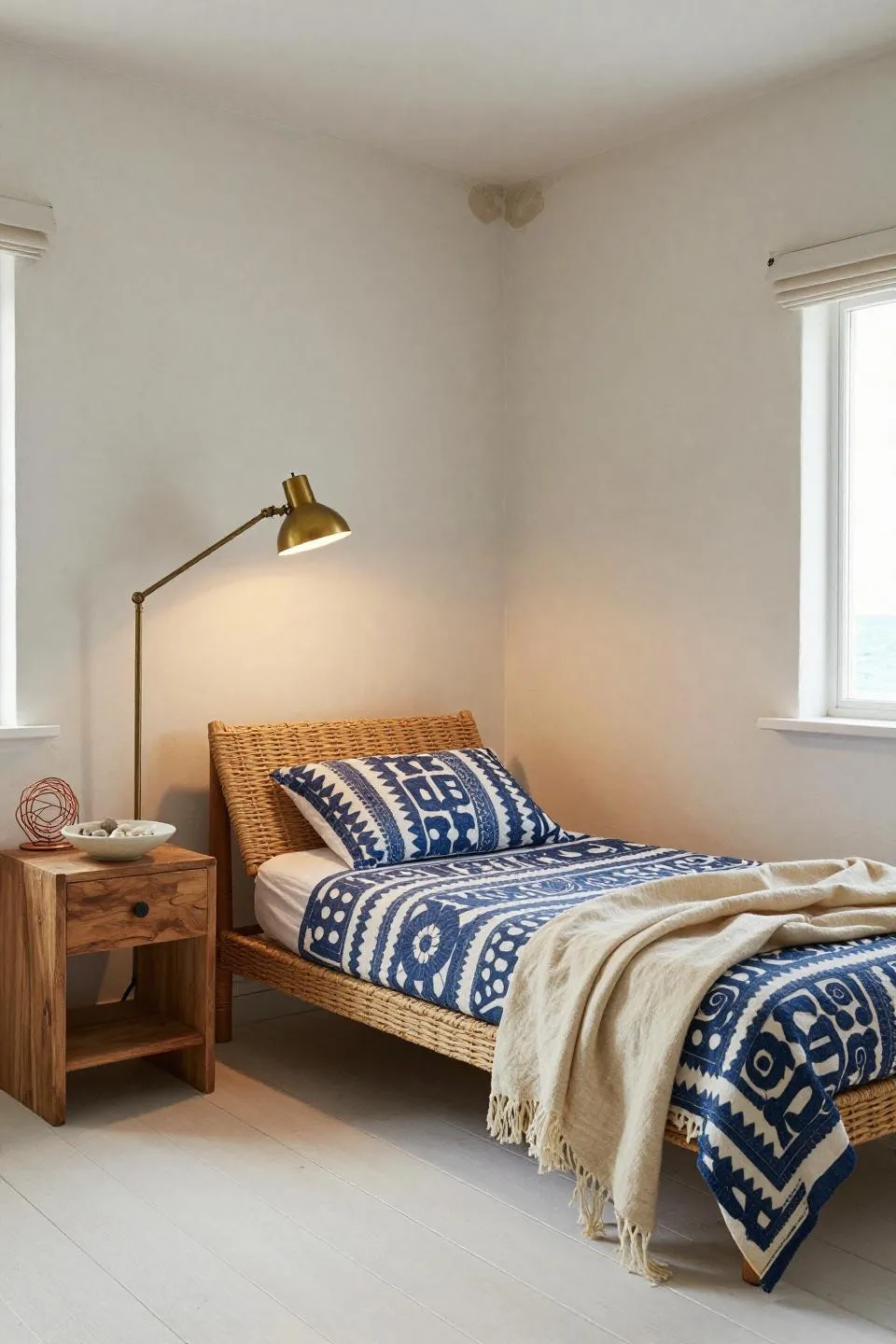 This works if you want texture without the rattan overload everyone’s doing. The indigo block-print coverlet against sage paint? That’s the combo. Brass swing-arm lamps are having a quiet moment right now—they give you focused light without screaming “I bought a whole beach theme.” The driftwood nightstand keeps it grounded. Just don’t overthink the styling (that beach stone dish is enough).