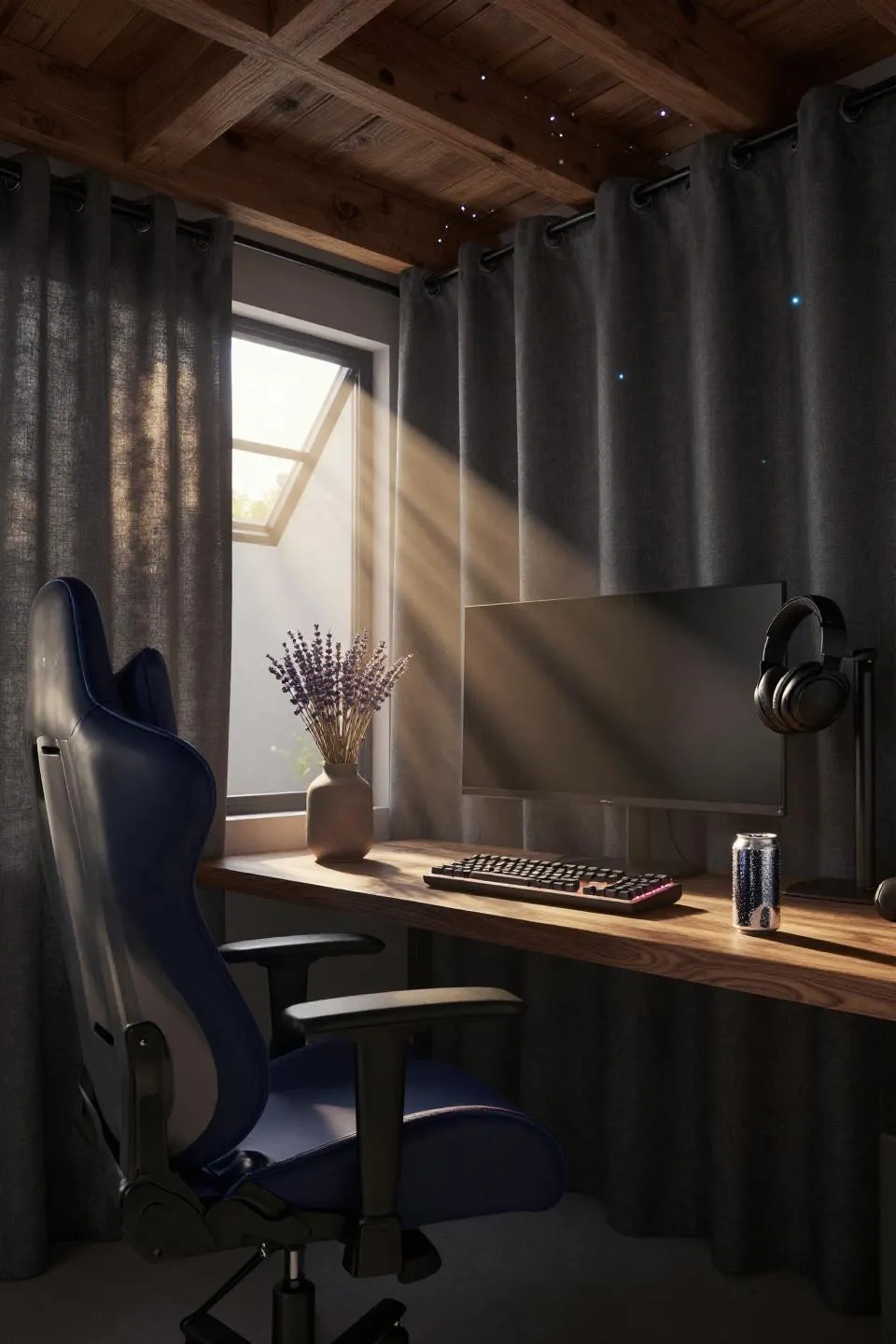 Waxed canvas curtains partition the space without closing it off completely. The fiber-optic star ceiling sounds gimmicky until you see it at night—it’s actually subtle. Navy cushion on steel chair, dried lavender on the walnut shelf, mechanical keyboard with warm RGB. This works because it doesn’t scream “gamer cave.” It just happens to have good lighting and smart cable management.