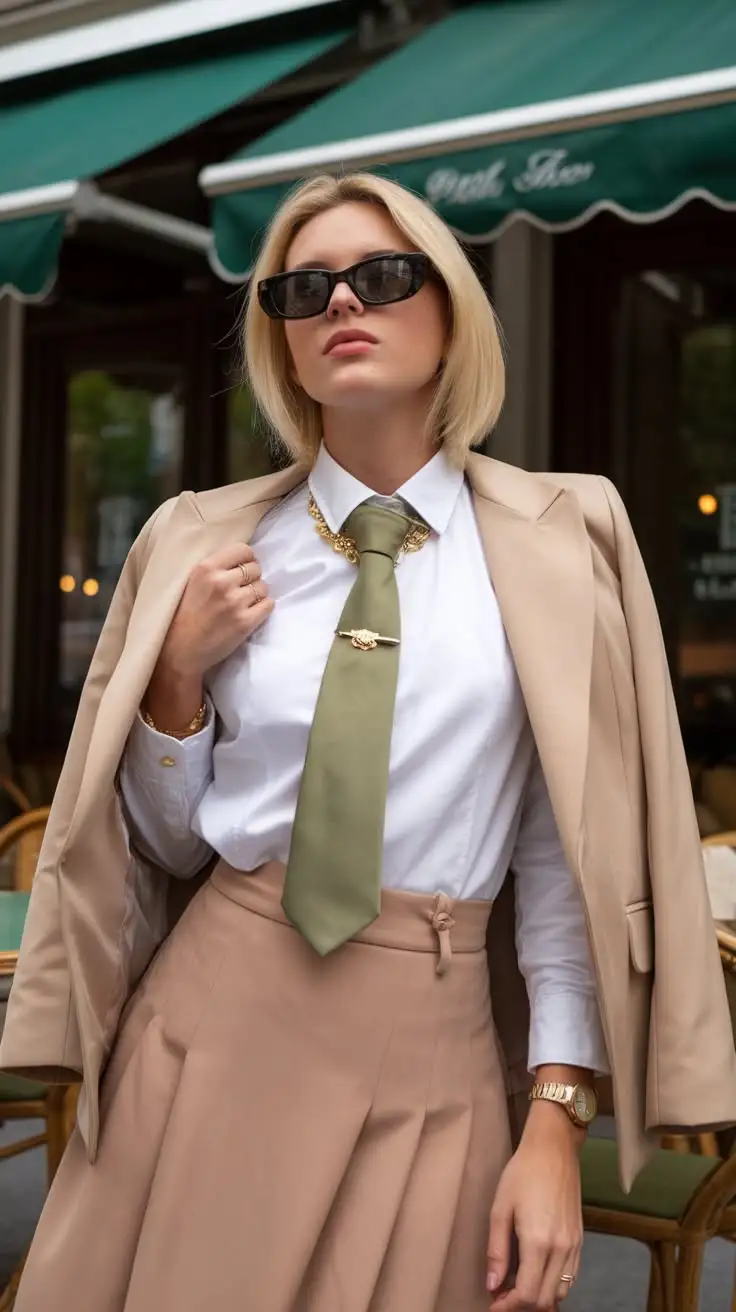 A beige power suit styled with a green silk shirt and yellow silk scarf. The cat-eye sunglasses and structured blazer create a powerful yet refined silhouette. The neutral palette with pops of color exemplifies sophisticated daytime dressing.