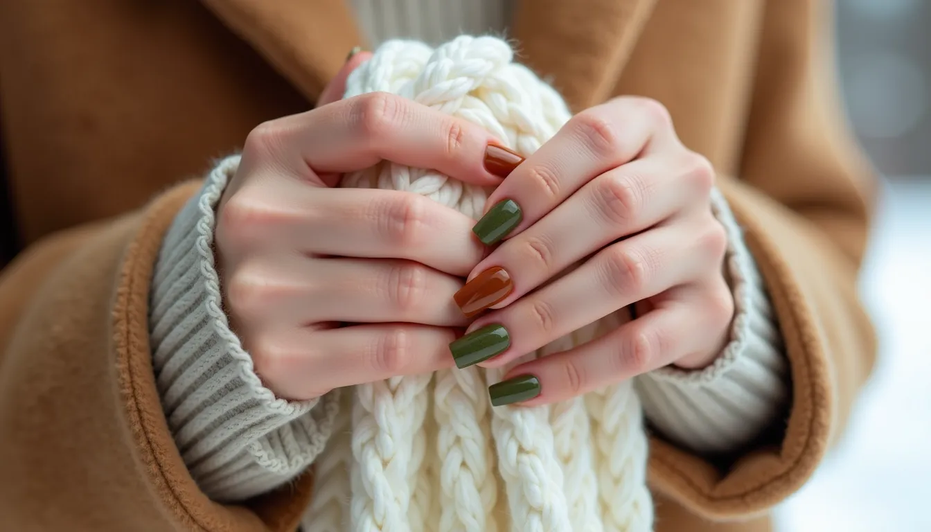 “Pair your earth-toned nails with bright winter accessories for a striking contrast,” suggests celebrity nail artist Jen Choi. “A moss green manicure looks stunning against a white sweater or a vibrant scarf.”