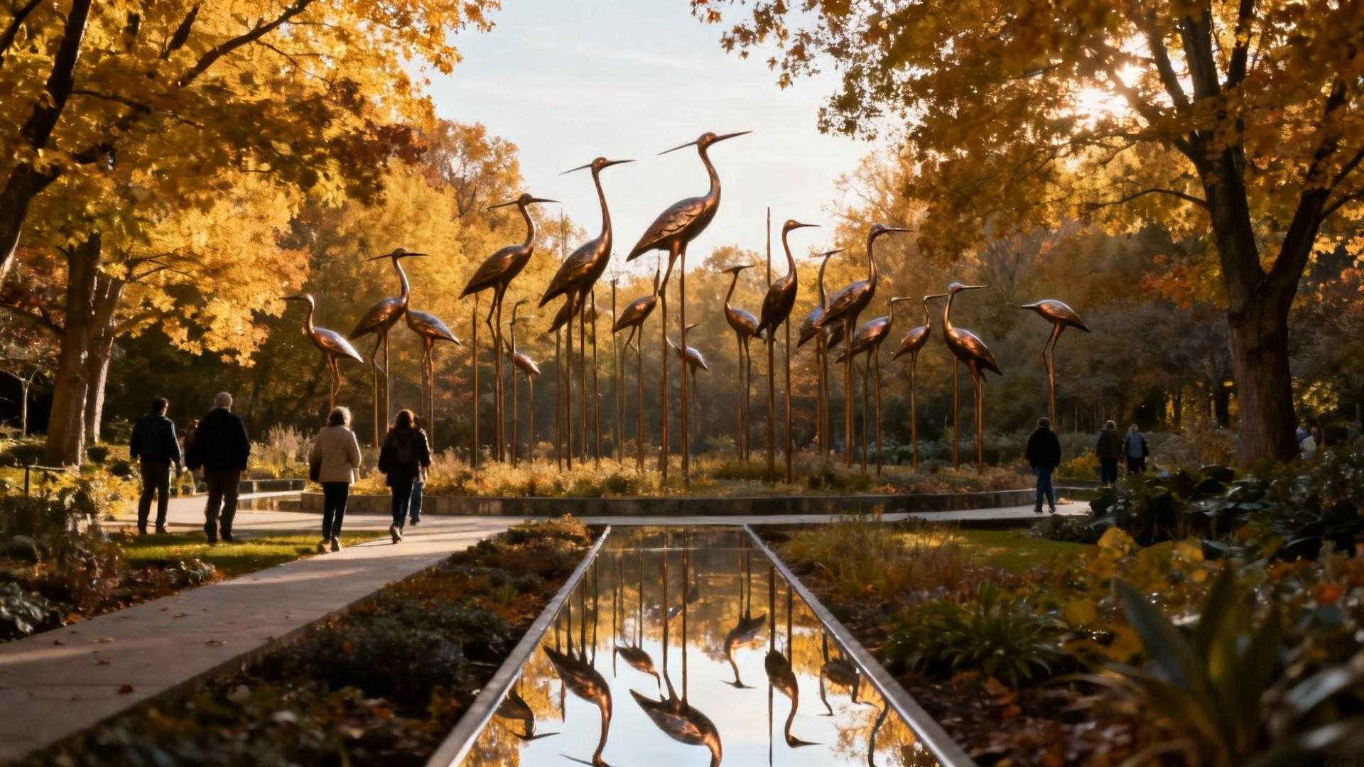Located at Aurora Municipal Center’s Water-wise Reflection Garden, this memorial represents the only place where commemorative art actively promotes healing rather than dwelling on loss. The 13 uppermost cranes feature translucent wings that glow in sunlight, while 70 white cranes represent those injured, all converging and rising skyward in a powerful symbol of community resilience.