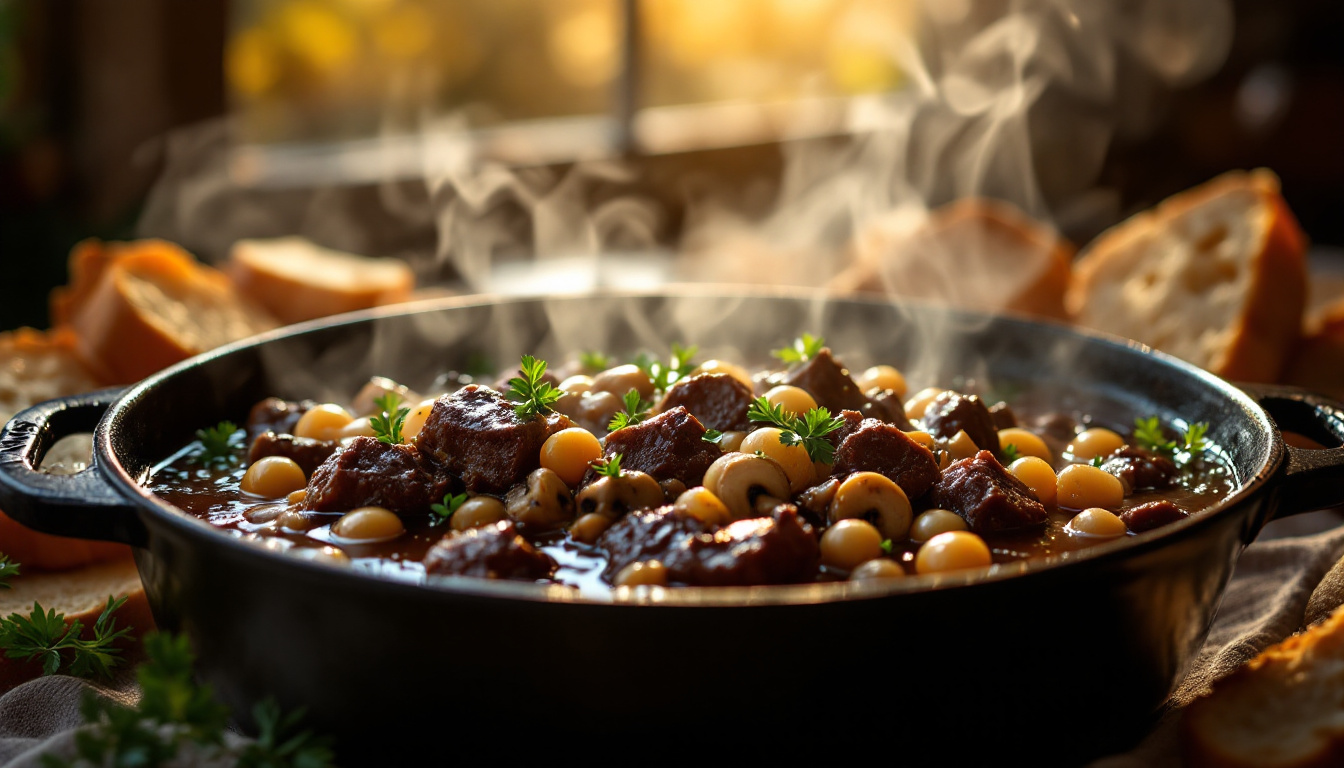 El aroma del Boeuf Bourguignon transportándose por toda la casa es uno de mis recuerdos más queridos de mis días como aprendiz en Dijon. Recuerdo a mi mentor, el Chef Bernard, susurrándome: «El secreto no está en cocinar rápido, sino en cocinar con amor y paciencia.» Este guiso emblemático francés representa todo lo que admiro de la cocina tradicional: transformar ingredientes sencillos en algo extraordinario mediante técnicas precisas y tiempo. Aunque antiguamente era el plato de los campesinos borgoñones, hoy es sinónimo de refinamiento y confort. ✨