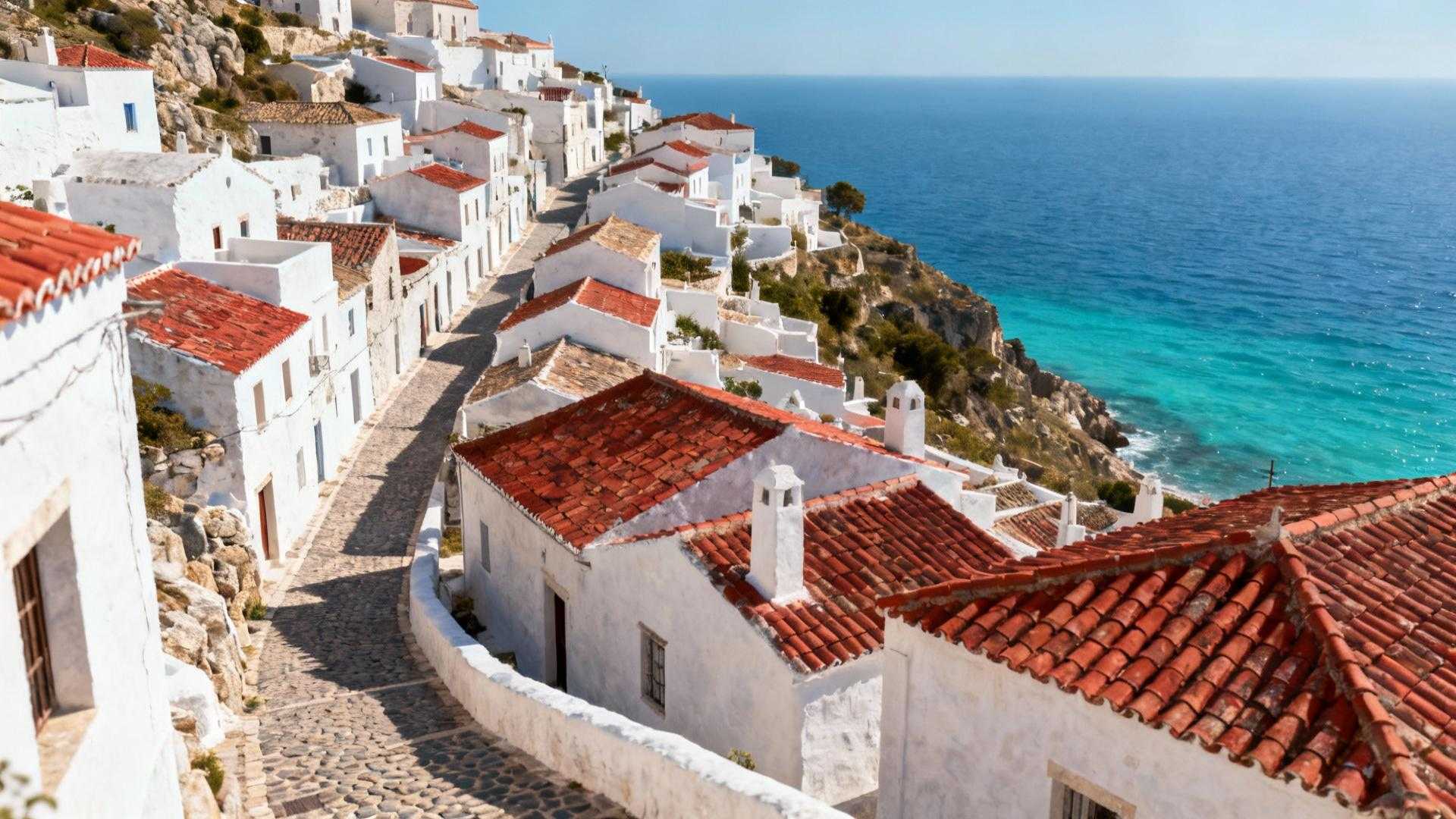 Calles estrechas protegen del sol de 28°C en verano. Patios interiores donde el azahar perfuma las tardes. Tejados rojos de teja árabe contrastan con el blanco inmaculado.