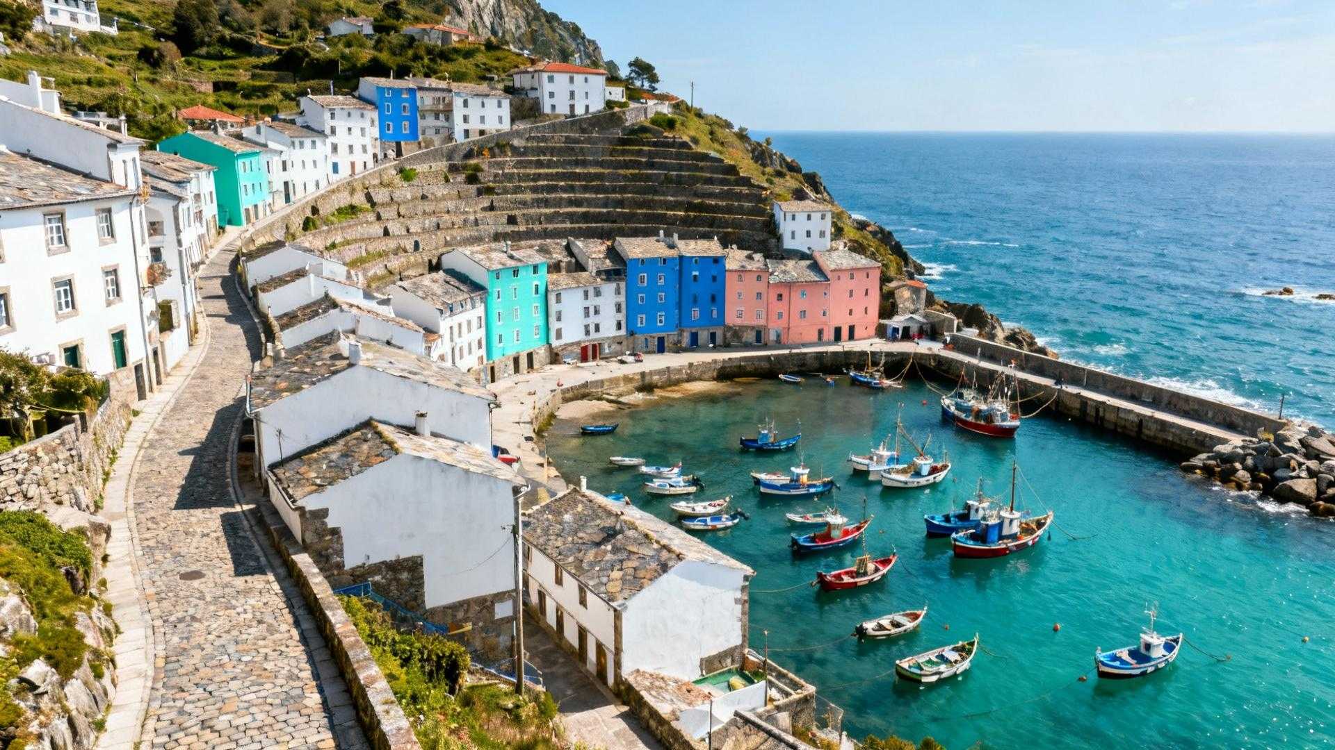La carretera AS-316 desciende en curvas cerradas hacia el mar. Cuando las casas de colores pastel aparecen escalonadas sobre el puerto, tu cerebro tarda segundos en procesar lo imposible: un anfiteatro natural de fachadas blancas, verdes agua y azules cielo que abrazan el Cantábrico. Solo 1.336 habitantes custodian este pueblo pesquero a 50 km de Gijón, donde barcos regresan cada madrugada con capturas de pixín.