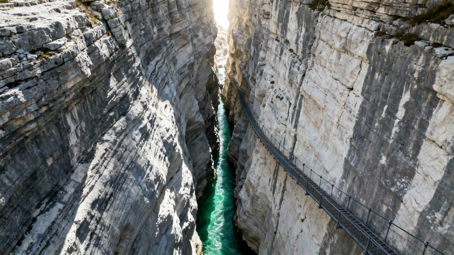 En el punto más estrecho, las paredes rocosas grises y blancas casi se tocan sobre tu cabeza. El agua verde azulado esmeralda brilla 200 metros más abajo, creando un efecto óptico que produce simultáneamente claustrofobia y vértigo.