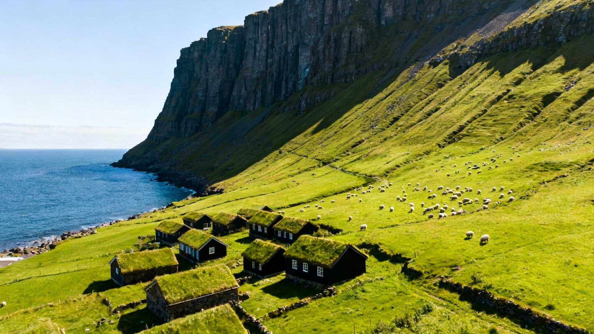 Las ovejas pastan en tejados verdes mientras el murmullo del viento atlántico marca el ritmo de vida más lento del archipiélago.