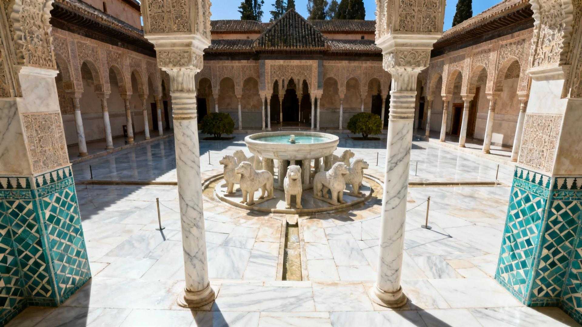 El Patio de los Leones concentra la esencia nazarí en 124 columnas de mármol blanco. Los arcos de mocárabes sostienen galerías donde la luz crea efectos cambiantes. La fuente central distribuye agua según geometría islámica perfecta, mientras azulejos turquesa y blancos forman patrones hipnóticos en los zócalos.