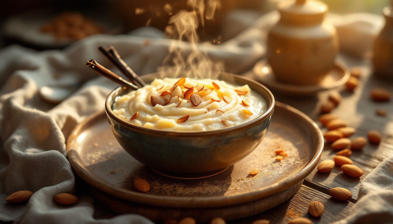 Rijstpudding verbindt ons met onze culinaire wortels. In Nederland noemen we het liefkozend “rijstebrij” of “rijstepap” – een gerecht dat zowel in paleizen als in boerderijen werd gegeten. Wat begon als een luxegerecht evolueerde tijdens moeilijke tijden tot troostvoedsel. Het bijzondere aan deze moderne bereiding is dat we terugkeren naar een veel oudere traditie: in de middeleeuwen gebruikten kloosterkeukens vaak amandelmelk tijdens vastenperiodes wanneer dierlijke producten verboden waren. Deze versie is dus zowel modern als een eerbetoon aan eeuwenoude bereidingswijzen. 🌍🕰️