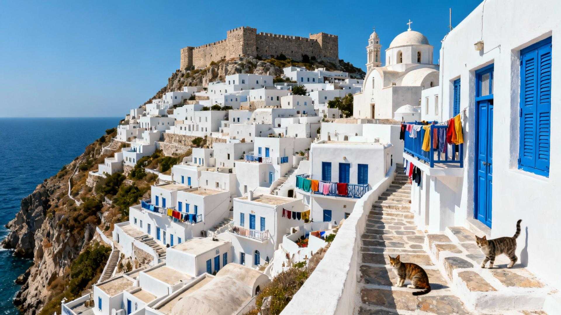 Klockan 18:29 smälter solen in i Egeiska havets horisont. Från fästningens murar 127 meter upp ser du hur Choras 327 vita hus tänder sina lampor. Elena Papadakis hänger tvätt mellan kykladisk arkitektur från 1292. Vinden bär timjan och salt. Detta är Grekland som väljer enkelheten dagligen.
