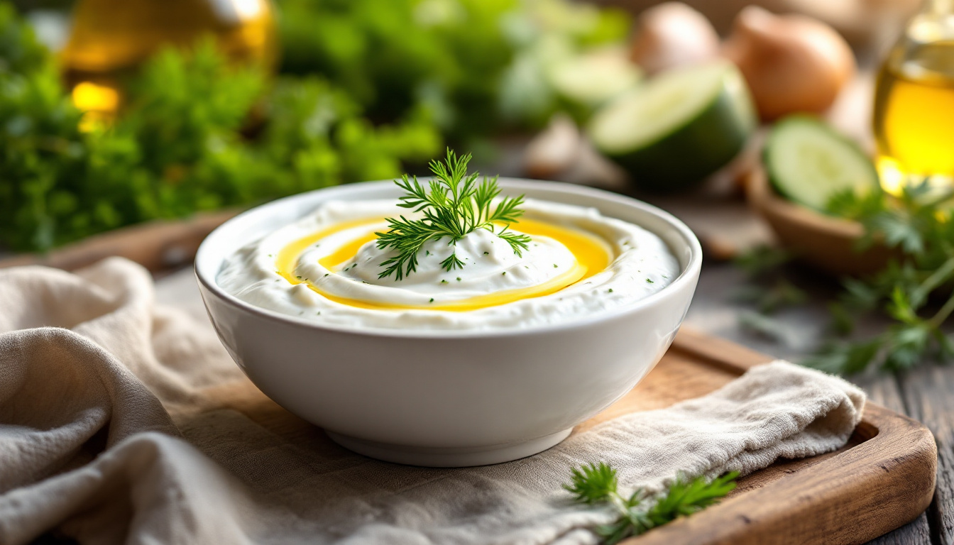För 4 portioner behöver ni: 500g tjock grekisk yoghurt (10% fetthalt), 1 stor gurka, 3-4 vitlöksklyftor, 3 matskedar extra virgin olivolja, 1 matsked vit vinäger, färsk dill, havssalt och svartpeppar. Kvaliteten på yoghurten är avgörande – välj alltid den tjockaste ni kan hitta.